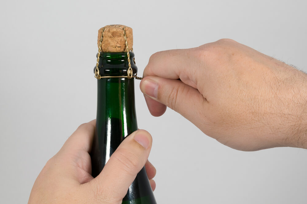まず、針金をクルクルと回してゆるめます。このとき、コルクが抜けてしまうこともあるので、コルクを人やわれやすいものに向けないようにしましょう。コルクを指で押さえながら針金をゆるめると安全です。