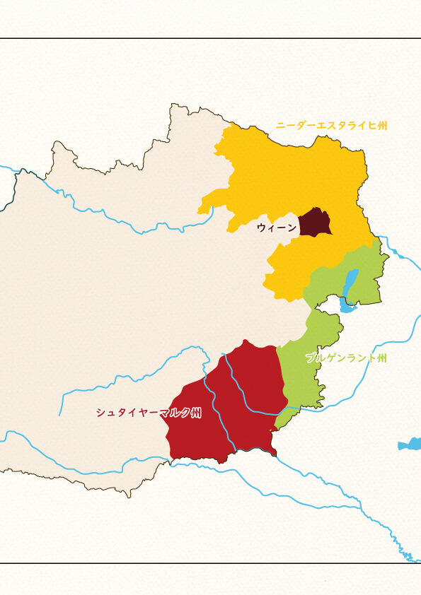 ワインの生産地域は主に東側に集中していて、もっともワインの生産が多いのが北東部のニーダーエスタライヒ州。国内ワインの60%の生産を誇り、主にグリューナー・ヴェルトリーナーをはじめ、リースリングなどが生産されています。