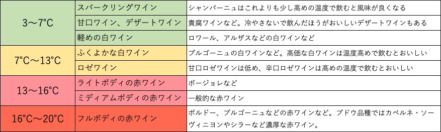 ワイン別の最適温度を表にまとめました。