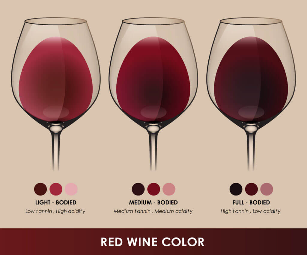 色や濃淡が異なるのは、ブドウ品種の違い、熟成期間、醸造方法に影響を受けるためです。