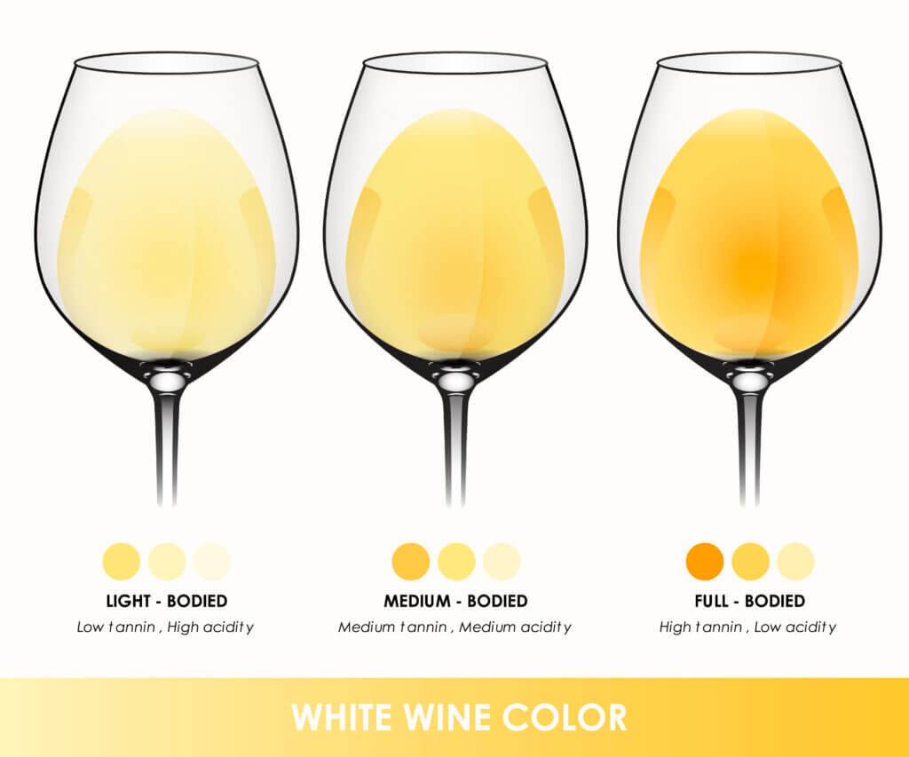 - ソーヴィニヨン・ブランなど果皮が緑色のものは緑がかったワインに、シャルドネなど黄色の果皮のものは黄みがかったワインになる